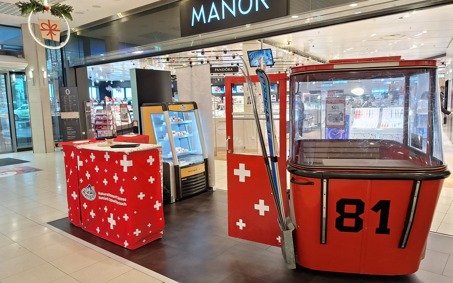 Véritable télécabine suisse vintage refaite à neuf avec une table en bois en son centre. Parfaite pour décorer vos évènements, créer des animations originales.