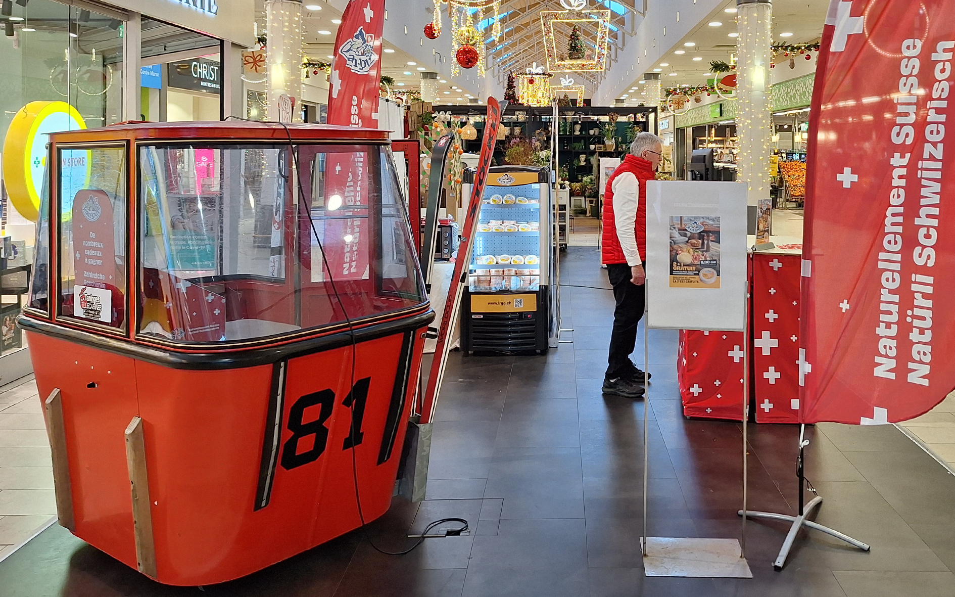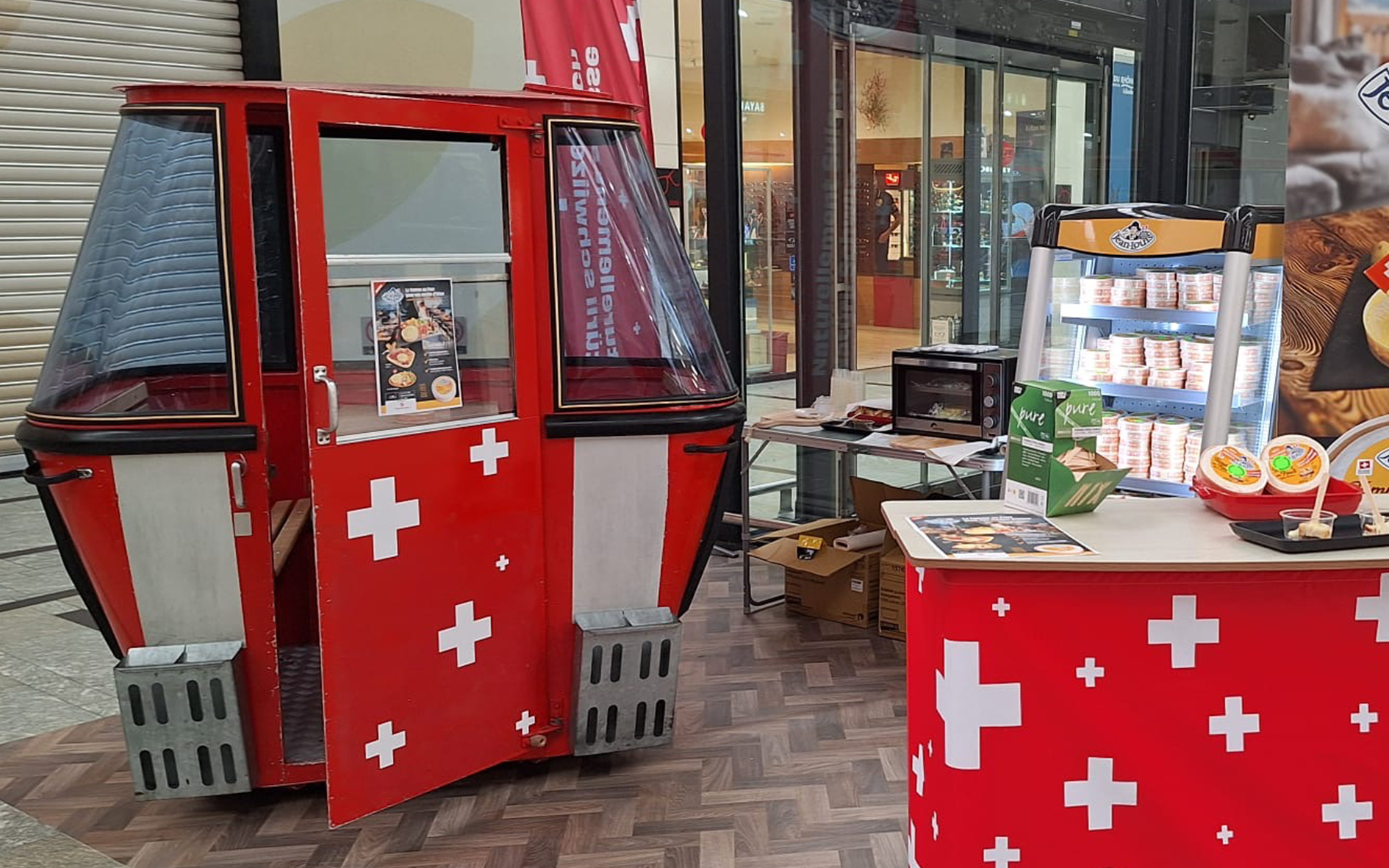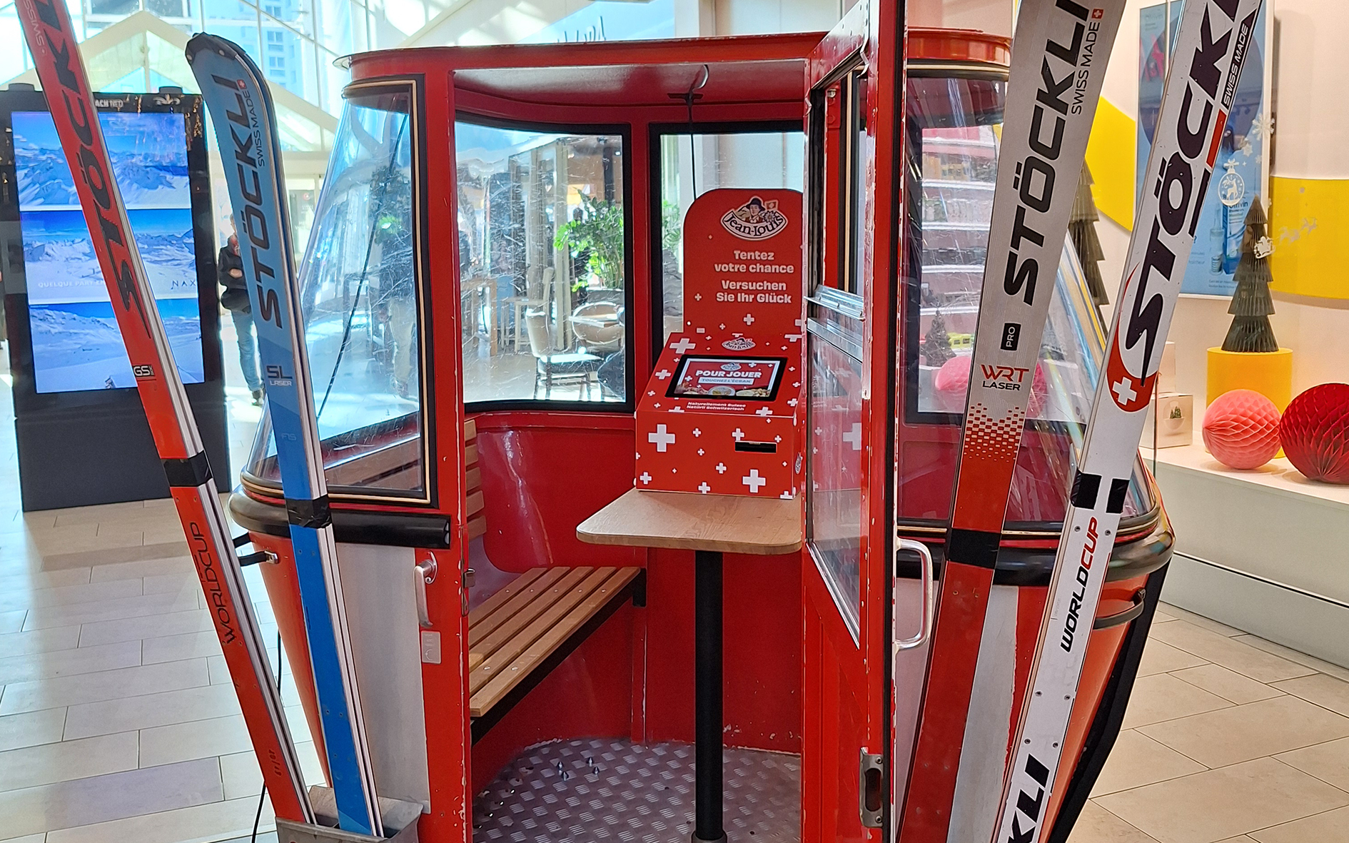 La télécabine peut parfaitement être utilisée par 4 personnes pour déguster une bonne fondue lors de vos manifestations, servir de décor central pour un photobooth original.